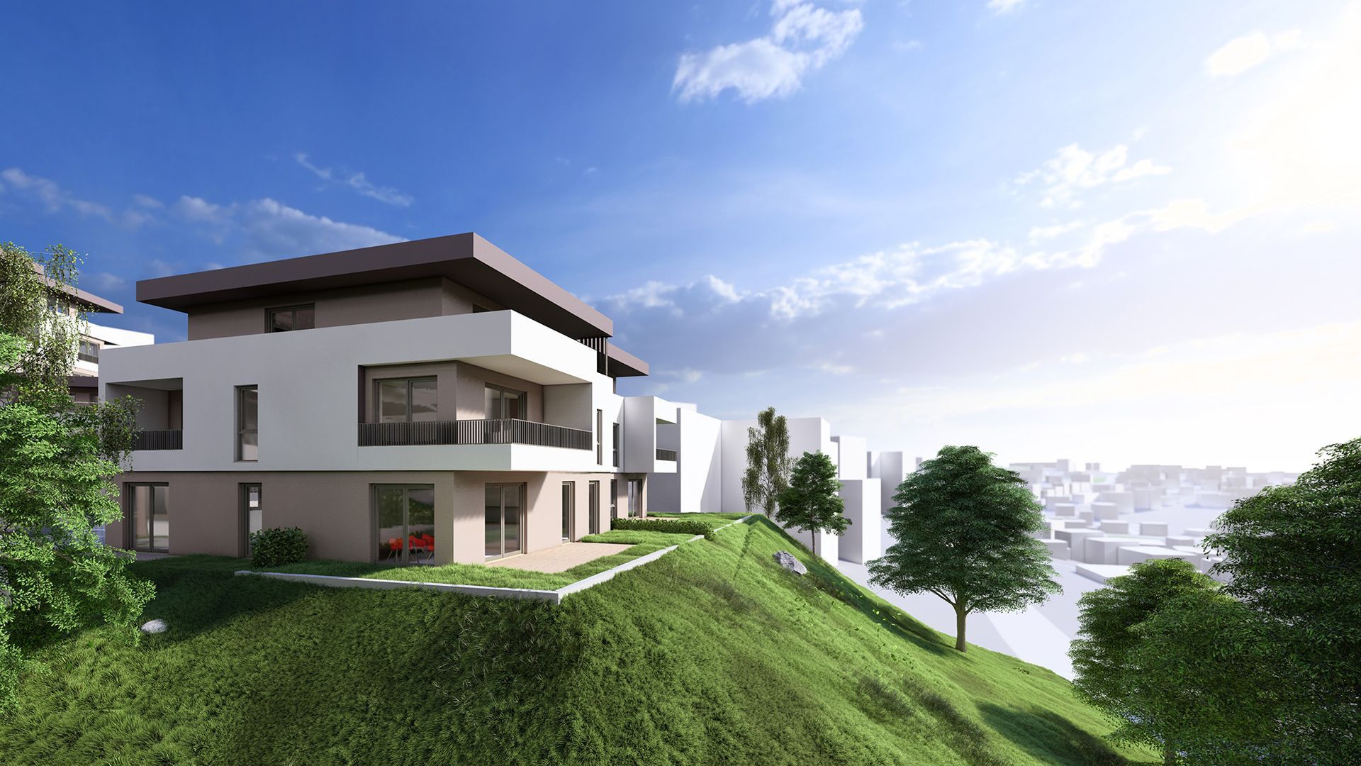 Die Geisenberg Terrassen beeindrucken mit eleganter Architektur, lichtdurchfluteten Räumen und Glasbrüstungen, die freie Ausblicke in die Natur eröffnen.
