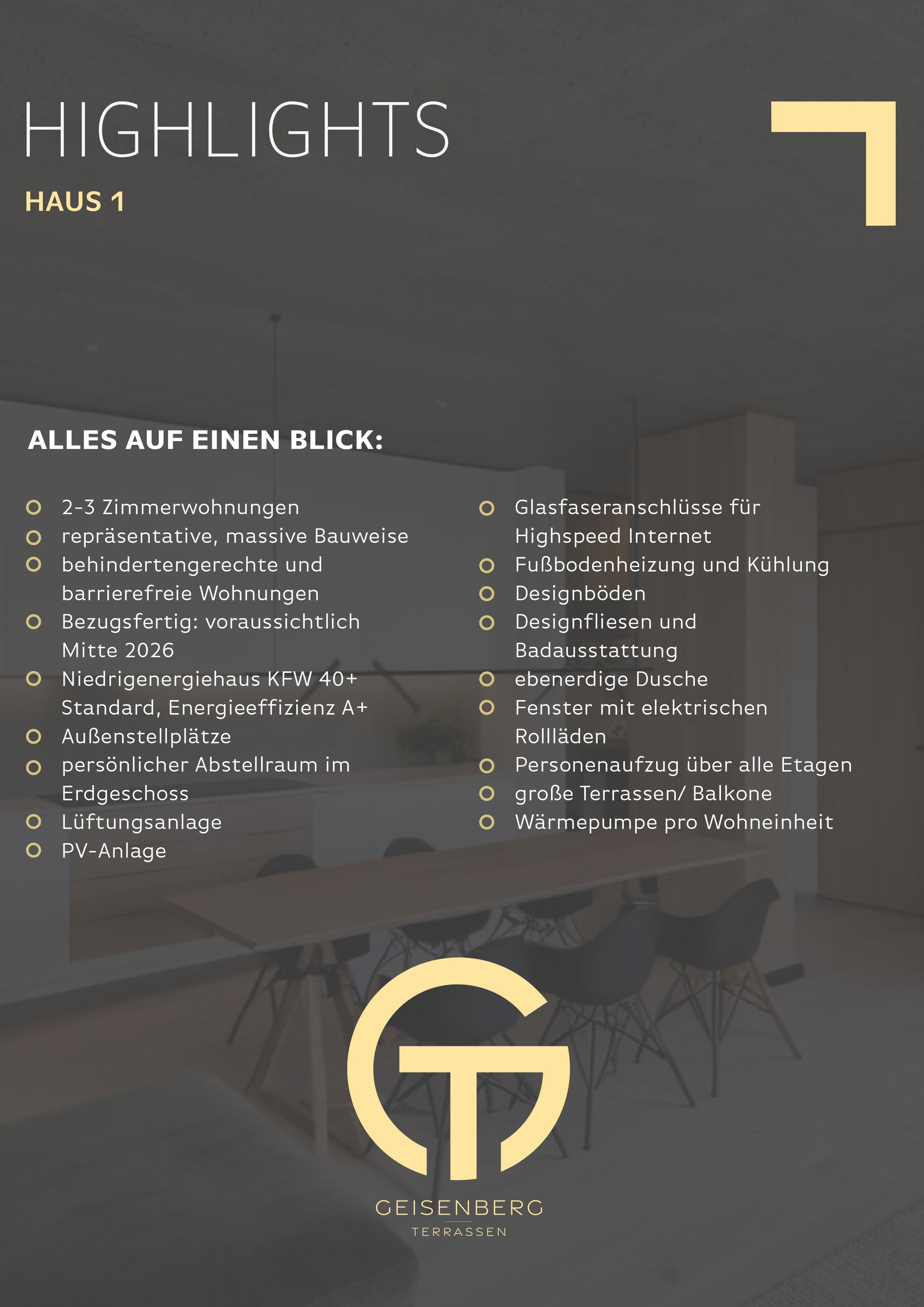 Mit ihrer modernen Architektur, der nachhaltigen Energieversorgung und der hervorragenden Wohnqualität sind die Geisenberg Terrassen ein zukunftssicheres und attraktives Wohnquartier.